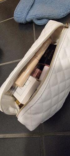 Sminkevesken er laget av PU-lær og har en nydelig quilt-stukket overflate med glidelås i gull. Den kommer i tre flotte farger, hvit, svart og selvfølgelig rosa.